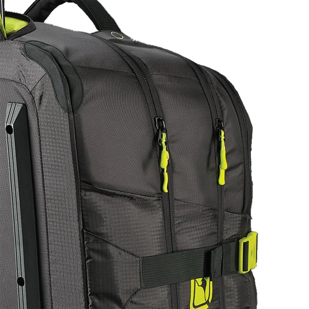 Base slide rails and grippy grab handles make for easy manoeuvring of your getaway gear, while heavy-duty zippers offer ultimate pack protection. This bag literally gets off your back about the tougher stuff too, thanks to oversized wheels that take you anywhere from the pebbles to pavement.