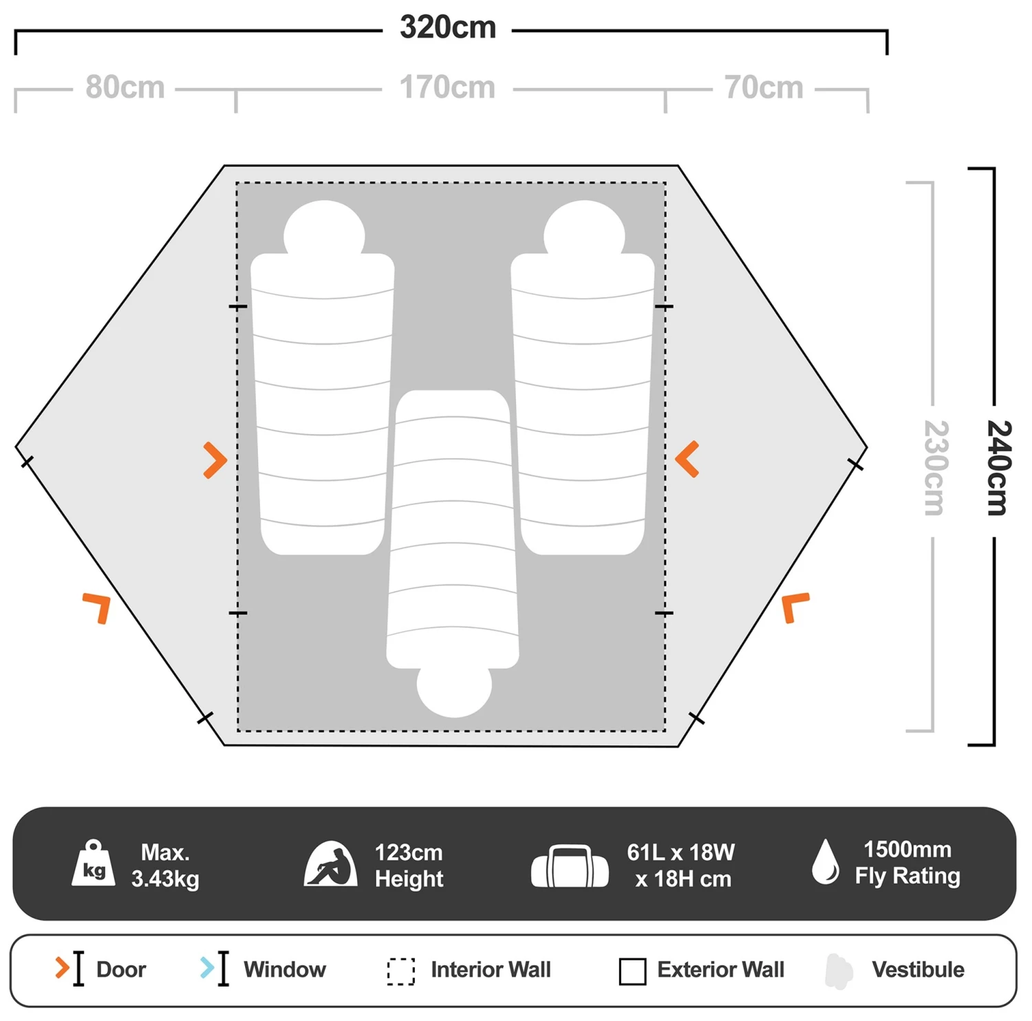 A free-standing design with colour-coded, easy-pitch clips and fly has this tent faster to set up than a marshmallow melts on an open flame. Sleep side by side in a tent that has you covered too, come rain, hail, and shine – with tiebacks on the full-coverage fly for stargazing, plus seam-taping to prevent water resistance and invasion during wet conditions.